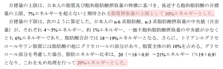 厚生労働省が作成した『日本人の食事摂取基準(2025年版)』によると、1日の脂質摂取量は成人の場合「総摂取カロリーの20~30%」が推奨されています。