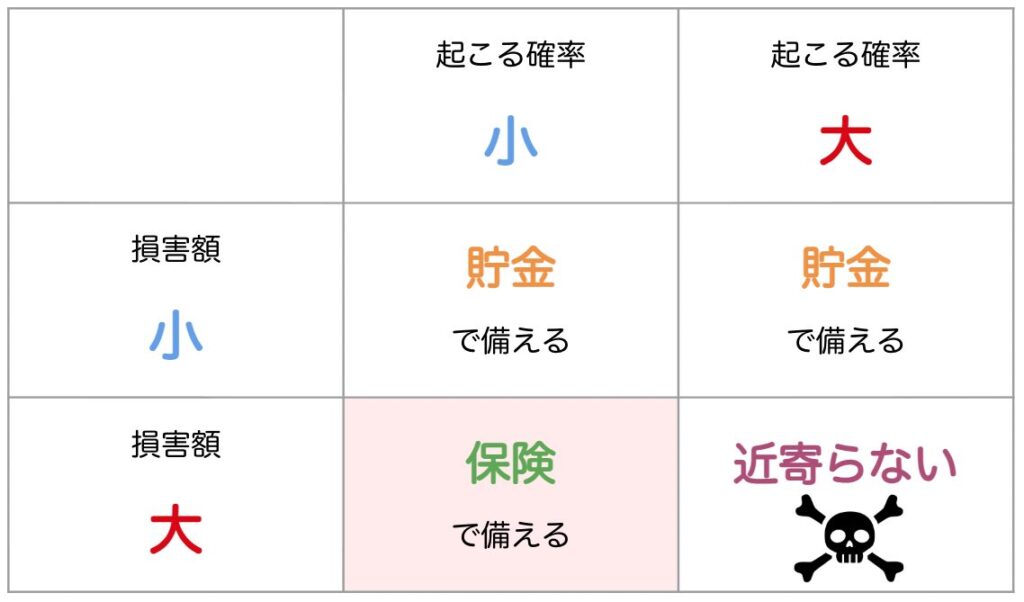 そして発生確率は低いけれど貯金では賄えないほどの損害額が予想されるリスクに対して保険で備えます。