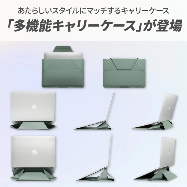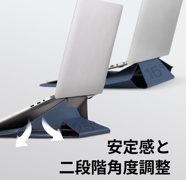 少々値が張りますが頑丈な作りで高級感があり、ケース開口部を折りたたむことでMac Bookを設置することが可能。更には2段階の角度調整ができます。柔らかい肌触りの素材にも関わらず、がたつきもありません。