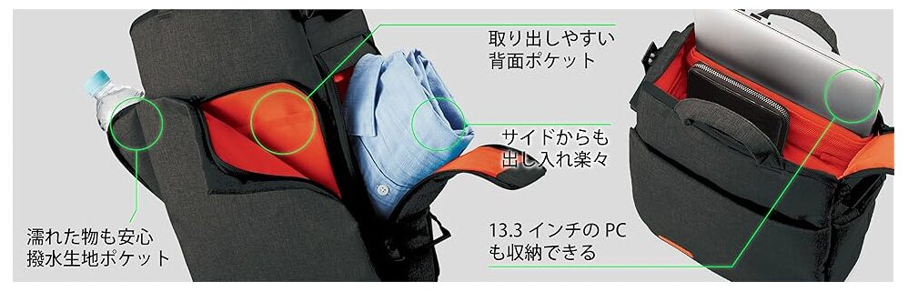 元々はデジカメの持ち運びをコンセプトにしたリュックのようですが、13インチ程度のノートパソコンがぴったり入り収納力も抜群です。野暮ったくならないシンプルなシルエットなのも◎
