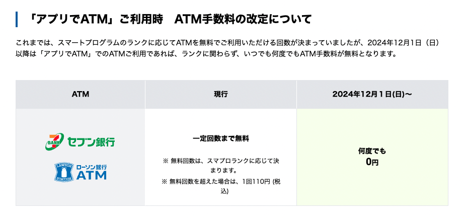 さらに2024年12月1日からは『アプリでATM』による手数料無料の回数が無制限になりました。とても嬉しい変更です。