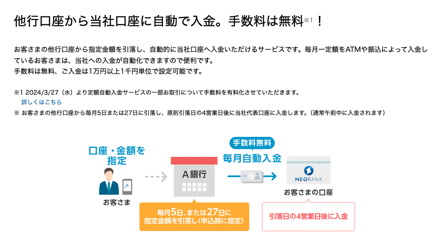 (定額自動入金サービスとは、)お客さまの他行口座から指定金額を引落し、自動的に当社口座へ入金いただけるサービスです。毎月一定額をATMや振込によって入金しているお客さまは、当社への入金が自動化できますので便利です。手数料は無料、ご入金は1万円以上1千円単位で設定可能です。