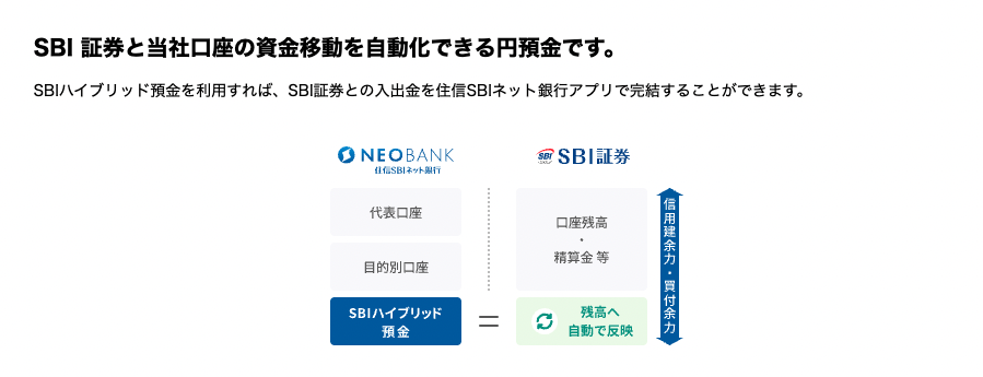 『住信SBIネット銀行』と『SBI証券』のアカウントを連携させることで『SBIハイブリッド預金』が利用できるようになります。